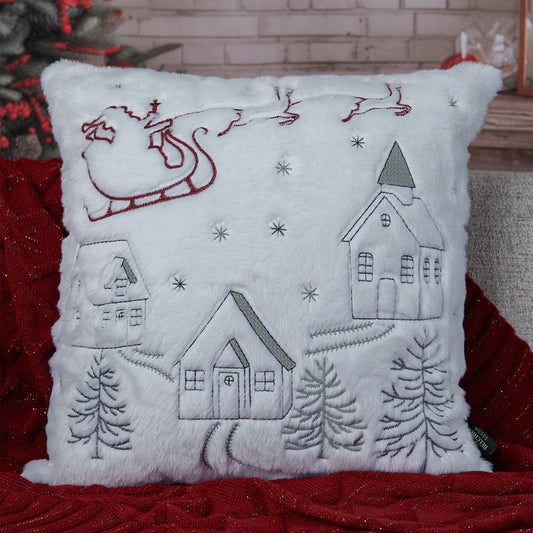 Capa Almofada Natalina Bordada c/ Pelúcia Branca e Veludo Vermelho 43x43cm