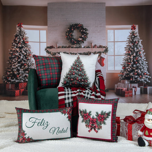 Capa p/ Almofada Aveludada Natalina Árvore de Natal Xadrez 43x43cm