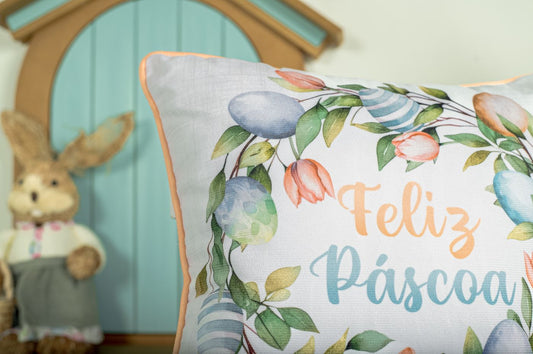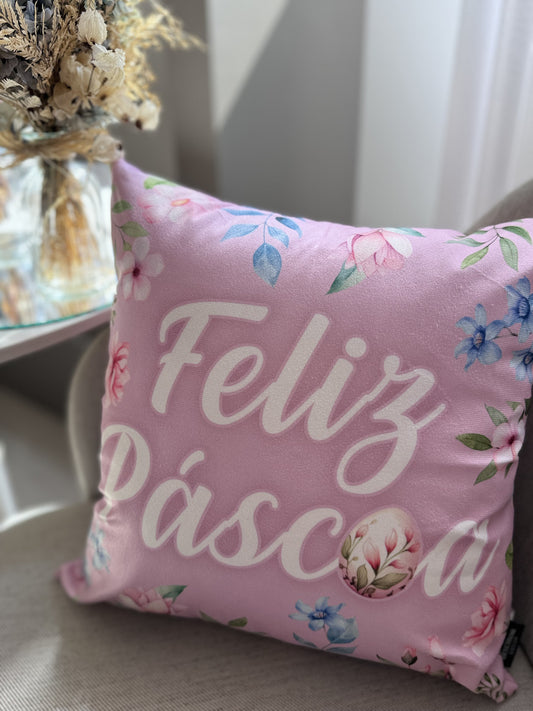 Capa Almofada Aveludada Feliz Páscoa Ovo e Flores 43x43cm