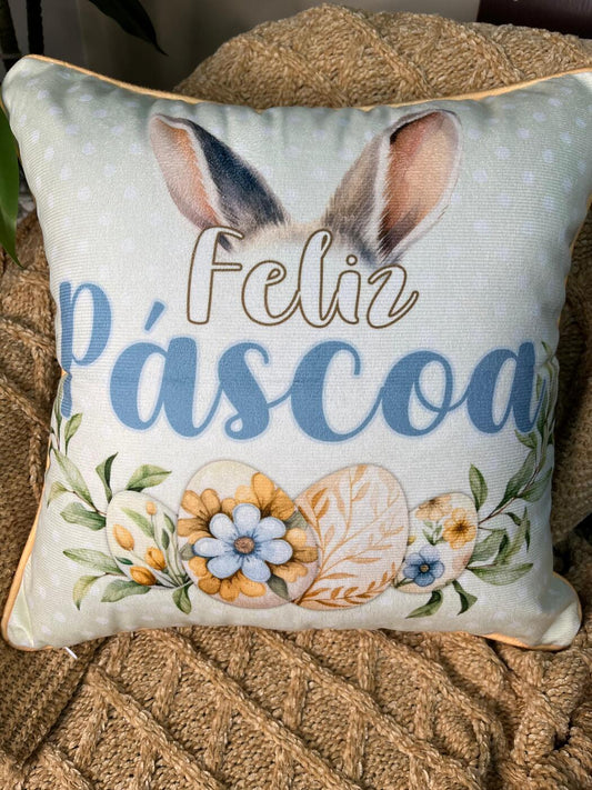 Capa Almofada Aveludada Coelho e Ovos Páscoa Flores 43x43cm