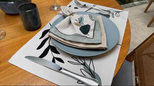 Kit 2 Guardanapos Linho Bordado Planta 40x40 + 2 Argolas
