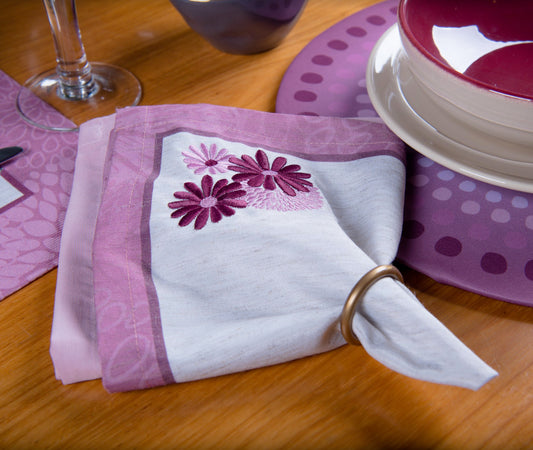 Kit 2 Guardanapos Linho Bordado Floral 40x40 + 2 Argolas
