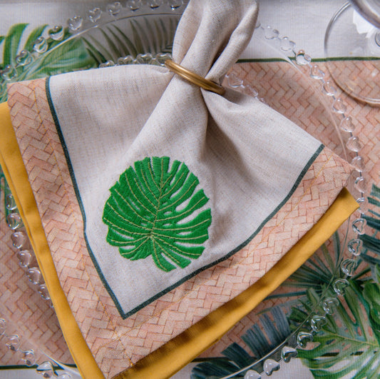 Kit 2 Guardanapos Linho Folha Tropical 40x40 + 2 Argolas