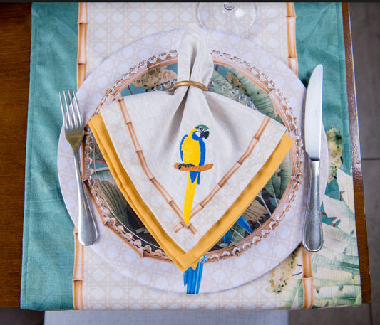 Kit 2 Guardanapos Linho Bordado Tropical 40x40 + 2 Argolas