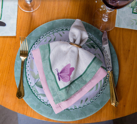 Kit 2 Guardanapos Linho Bordado Borboleta 40x40 + 2 Argolas
