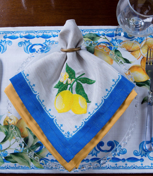 Kit 2 Guardanapos Linho Bordado Limão 40x40 + 2 Argolas
