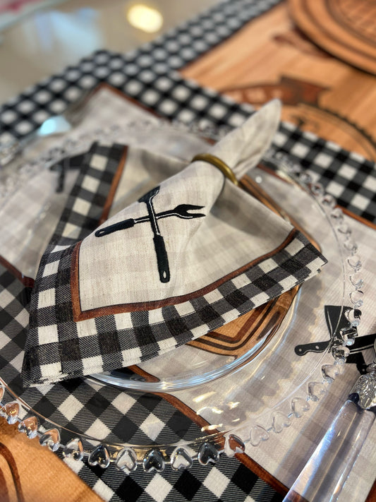 Kit 2 Guardanapos Linho Xadrez Preto 40x40 + 2 Argolas