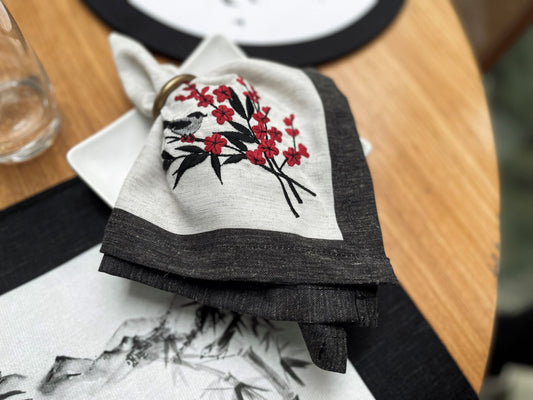 Kit 2 Guardanapos Linho Bordado Oriental 40x40 + 2 Argolas