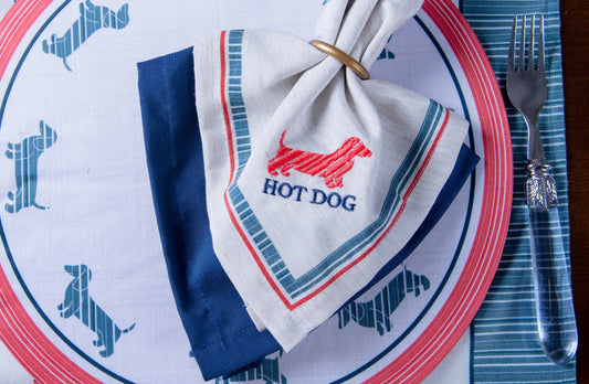 Kit 2 Guardanapos Linho Bordado Hot Dog 40x40 + 2 Argolas