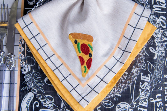 Kit 2 Guardanapos Linho Bordado Pizza 40x40 + 2 Argolas