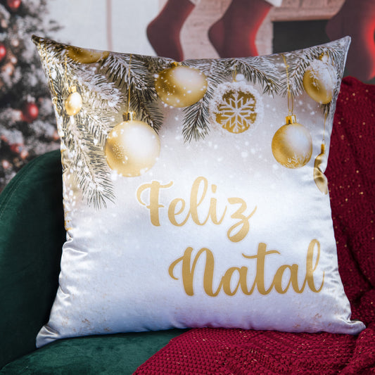 Capa p/ Almofada Cetim Natalina Feliz Natal Dourado 43x43cm