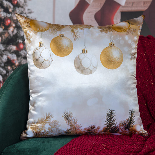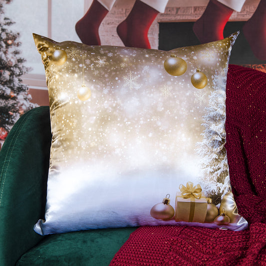Capa p/ Almofada Cetim Natalina Neve Presentes e Bolas Douradas 43x43cm