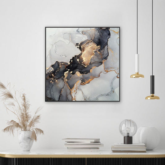 Quadro Abstrato Dourado Tela em Tecido Moldura 3D Preta - Médio 60x60cm