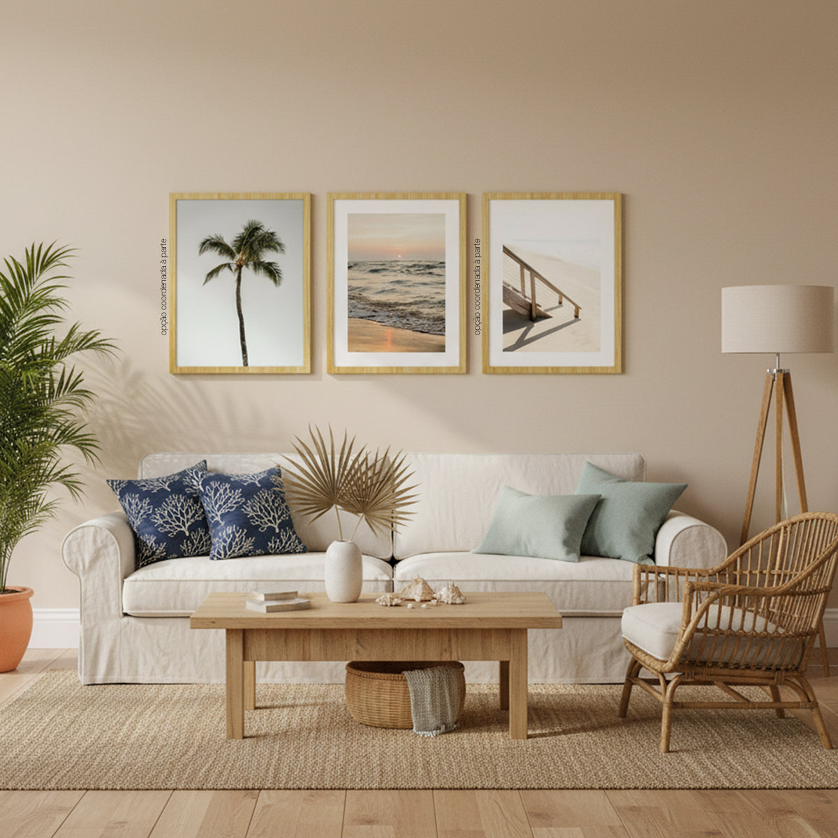 A linha de quadros Beach foi inspirada na beleza natural das praias paradisíacas, tendo como objetivo proporcionar uma sensação de tranquilidade e conexão com a natureza, seja em residências ou espaços comerciais.