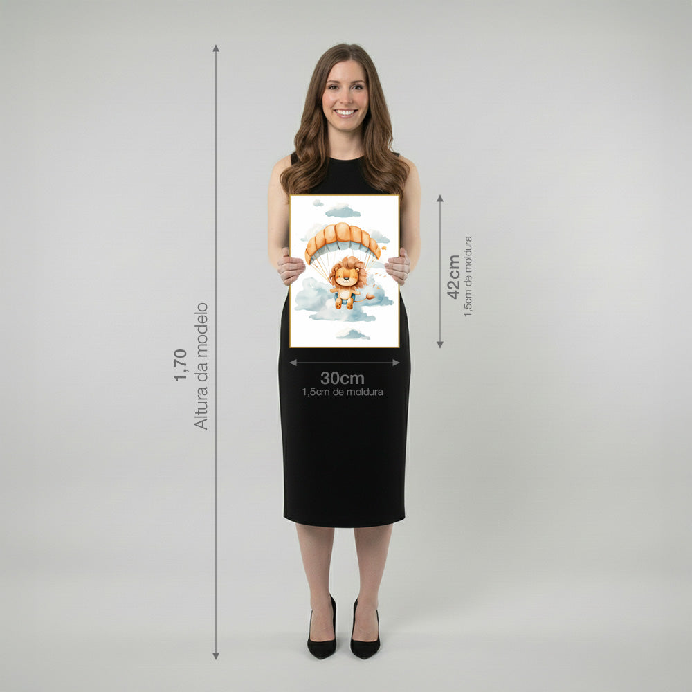 Quadro Infantil Leão Tela Fosca Moldura Amadeirada - Pequeno 32x42cm